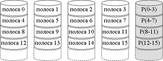 Все пользовательские и системные данные рассматриваются как хранящиеся на одном логическом диске. Диск делится на полосы, которые могут быть физическими блоками, селекторами или другими единицами хранения. Полосы циклически размещаются на последовательных дисках массива. В n-дисковом массиве первые n полос распологаются как первые полосы каждого из n дисков; вторые n- как вторые полосы каждого из n дисков и т.д.