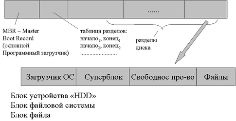 Системное устройство может иметь следующую структуру. Начало - основной программный загрузчик (нулевой блок системного устройства). Аппаратный загрузчик сначала обращается в основной программный загрузчик. А основной программный загрузчик уже будет обращаться к соответствующему загрузчику ОС. Далее на системном блоке находится так называемая таблица разделов. Раздел – это есть виртуальный диск. Одно пространство дискового устройства можно разделить на некоторые порции в общем случае непересекающиеся, которые называются разделами, и каждый раздел представляется в системе как отдельное дисковое устройство. Соответственно структура раздела с ФС обычно следующая: в начале идет блок загрузчика ОС. Загрузчик ОС уже знает с какой ОС он будет работать, он знает где находится информация в разделе, которая необходима для загрузки ОС и соответственно выбирает ее при запуске. Далее за блоком загрузчика ОС обычно находится последовательность блоков или блок, который называется суперблок.