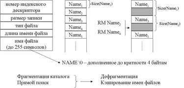 Структура каталога немного изменяется. К двум содержательным полям добавляется номер индексного дескриптора, размер записи, т.е. записи каталога, тип файла, длина имени и имени разрешается быть длиной до 256 символов. Соответственно может возникнуть некоторое недопонимание, т.к. есть параметр размер записи и длина имени. Суть использования того и другого параметра заключается в том, что при удалении информации (какого-то имени) из каталога свободное пространство присоединяется к предыдущей записи и получается, что размер больше той содержательной информации, которая имеется. Соответственно может появиться внутренняя фрагментация.