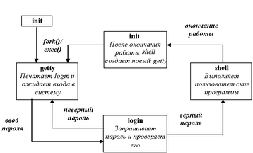 Таким образом процесс init поддерживает многопользовательскую структуру во время функционирования системы.