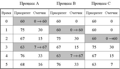 Рассмотрим на примере, как это все работает. Предполагается, что есть три процесса, которые создаются одновременно с одним и тем же базовым приоритетом (в данном случае – это число 60). Таймер прерывает выполнение процесса 60 раз в секунду. Предполагается, что не один процессов не блокируется сам, и нет других процессов, готовых к выполнению. Для простоты пользовательская составляющая nicej игнорируется. Происходит пересчет времени и приоритетов.