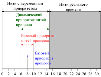 Приоритет нити может отклоняться от своего базового приоритета, и это может быть не связано с изменением базового приоритета процесса ( см. диапазон значений динамического приоритета нитей).