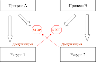 Есть два процесса А и В, каждому из которых в некоторый момент требуется иметь доступ к двум ресурсам R1 и R2. Процесс А получил доступ к ресурсу R1, и следовательно, никакой другой процесс не может иметь к нему доступ, пока процесс А не закончит с ним работать. Одновременно процесс В завладел ресурсом R2. В этой ситуации каждый из процессов ожидает освобождения недостающего ресурса, но оба ресурса никогда не будут освобождены, и процессы никогда не смогут выполнить необходимые действия.