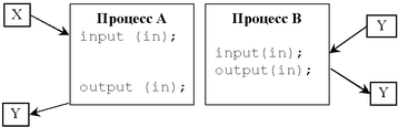 Посмотрим на рисунок и представить себе, что время идет сверху вниз. Оба процесса выполняют некоторую условную функцию if, в которой есть условный input (ввод некоторого символа) и условный output (вывод этой же переменной) понятно, что реализация этих функций нас сейчас не очень волнует, нас волнует в первую очередь то, что сейчас произойдет. Видно, что при такой ситуации у нас получается, что процесс А считал в разделяемую переменную in некоторый символ, после чего управление было передано на процесс В, и процесс В затер значение, которое считал процесс А. После чего он вывел новое значение, управление опять было передано процессу А, и процесс А вывел значение, не то которое он считал, а то, которое было затерто уже процессом В. Т.е. один из символов просто потерялся, в то время как другой был выведен дважды. Здесь предполагается, что in – это некоторая разделяемая переменная, т.е. некоторый разделяемый ресурс. В данном случае эта переменная и будет разделяемым физическим ресурсом