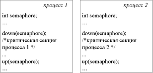 Здесь мы видим условную переменную типа int – она здесь семафор, но на самом деле она не int, а типа данных семафор. Значит каждый из процессов, перед тем как работать с критическим ресурсом, т.е. перед тем как войти в свою критическую секцию делает операцию down() на семафор (семафор для всех один и тот же) и на выходе из своей критической секции он делает операцию up(). Представьте себе, что процесс 1 подошел к своей критической секции в то время, как семафор свободен (ресурс свободен). Он выполняет операцию down(), тем самым значение семафора становится равным 0 (т.к. вначале было равно 1), и процесс 1 получает возможность работать в своей критической секции. Если в этот момент процесс 2 захочет попасть в свою критическую секцию, т.е. тоже поработать с нашим ресурсом, то при попытке выполнить операцию down() он будет заблокирован, поскольку значение семафора 0 и уменьшиться оно уже не может. Соответственно он будет ожидать до тех пор, пока процесс 1 не выйдет из своей критической секции, после чего процесс 2 будет автоматически разблокирован в тот момент, когда процесс 1 выполнит up(), и тем самым попадет в свою критическую секцию. Понятно, что это реализует взаимное исключение.