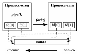 Сначала идет вызов pipe, затем fork(), благодаря которому образуется несколько процессов, и соответственно внутри if (fork()) процесс-отец, он закрывает дескриптор чтения и пользуется только записывающей стороной. В сыне происходит, соответственно, происходит все наоборот, он закрывает дескриптор записи и осуществляет чтение из канала. Как правило, канал используется как однонаправленное средство, т.е. данные будут передвигаться только в одном направлении, в данном случае от отца к сыну: отец записывает данные – сын их читает в том же порядке, в котором их записал отец. Обратите внимание на закрывание дескрипторов. Понятно, что это, в принципе, не нужно, поскольку если программа будет завершена, то все дескрипторы и так закроются. Но в данном случае эта строка имеет очень важный смысл: ранее уже говорилось о том, что при попытке чтения большего числа байт из канала, чем в нем находится, чтение будет заблокировано в том случае, если в канале не находится символ EOF, который туда попадает, когда закрывается последний записывающий дескриптор. Последний записывающий дескриптор будет закрыт тогда, когда его закроет процесс-отец, т.е. он запишет все необходимые данные, после чего закроет дескриптор, и собственно это будет означать, что больше данных не будет. В случае, если сын не закроет свой унаследованный дескриптор записи, то после того, как отец закроет свой дескриптор записи останется еще один записывающий дескриптор к тому же каналу в процессе сыне. Хоть он его и не использует (но системе-то это неизвестно), в последнем чтении процесс-сын зациклится, т.к. символ EOF в канал не попадает (поскольку в момент закрытия записывающей стороны это не последний записывающий дескриптор). Поэтому ненужные дескрипторы записи в канал важно обязательно закрывать, потому что иначе последнее чтение из канала будет заблокировано навечно.