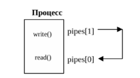 Процесс посылает данные самому себе. Описан массив из двух целых чисел, который передается в функцию pipe (в системный вызов pipe), pipe его заполнил. Далее, используя нулевой дескриптор, осуществляем чтение из канала, используя первый – запись. Понятно, здесь просто строчка записывается, потом считывается. Затем закрываются оба дескриптора из pipes. Прочитанная строка записывается на стандартный вывод и после этого программа завершается. Пример условный, потому что в рамках одного процесса каналы никто не использует.