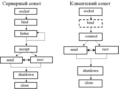 Мы рассмотрели все основные функции работы с сокетами. Обобщая изложенное, можно изобразить общую схему работы с сокетами с установлением соединения в следующем виде
