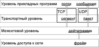 Уровень транспортных протоколов семейства представляется двумя протоколами TCP и UDP. Протокол TCP оперирует сегментами. UDP – пакетами. На уровне прикладных программ, системы построенные на использовании протокола TCP используют поток данных, а системы использующие UDP - сообщения.