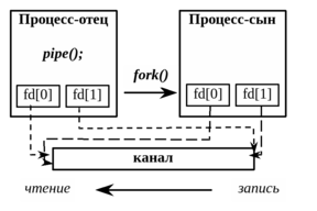 Чаще всего, однако, канал используется для обмена данными между несколькими процессами. При организации такого обмена используется тот факт, что при порождении сыновнего процесса посредством системного вызова fork() наследуется таблица файловых дескрипторов процесса-отца, т.е. все файловые дескрипторы, доступные процессу-отцу, будут доступны и процессу-сыну. Таким образом, если перед порождением потомка был создан канал, файловые дескрипторы для доступа к каналу будут унаследованы и сыном. В итоге обоим процессам оказываются доступны дескрипторы, связанные с каналом, и они могут использовать канал для обмена данными.
