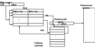 В поле два адреса – виртуальный и реальный. Осуществляется быстрый параллельый поиск vp и offset. Если не нашли – ситуация miss (промах), то возникает прерывание – ОС обращается в таблицу страниц, которая находится в ОП, находит там информацию. Если всё нормально, то TLB строится заново, поэтому промахи относительно редки.