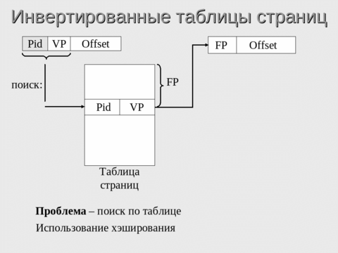 Мы рассматривали случаи, когда есть аппаратная таблица страниц. Сделаем преобазование – замену в вируальном адресе на соответствующий номер физической страницы. В таблице будет: (Номер строки)=(номер виртуальной страницы)+(некоторые атрибуты) – получаем, что вся информация находится в памяти, всё это должно быть реализовано аппаратно. При смене процесса ЦП должне перераспределять страницы. Размер страниц и их количество зависит от разрядности. Накладные расходы очень большие – поэтому не существует аппаратной реализации такой таблицы.