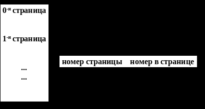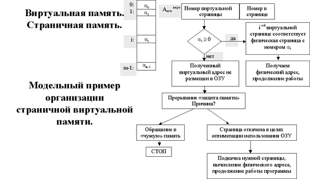 Модельная (упрощенная) схема организации функционирования страничной памяти ЭВМ следующая: Пусть одна система команд ЭВМ позволяет адресовать и использовать m страниц размером 2k каждая. То есть виртуальное адресное пространство программы/процесса может использовать для адресации команд и данных до m страниц.
