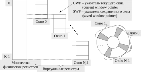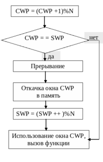 егистровые окна – метод решения проблемы запуска подпрограмм. В системе может быть реализовано K регистровых окон, каждое из которых ставится в соответствие одной из подпрограмм. Благодаря указателям текущего и сохраненных окон, ОС ориентируется, какой набор значений регистров сейчас актуален.
