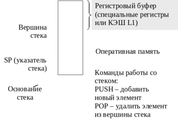 тек аппаратно не реализован, является частью оперативной памяти и управляется программно. Поступающие прерывания запихиваются в стек, если не могут быть сразу обработаны. Стек строится таким образом, что последний запихнутый элемент выпихивается первым. Использование системного стека может частично решать проблему минимизации накладных расходов при смене обрабатываемой программы и/или обработке прерываний.