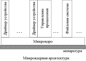 икроядерная система – система, в которой одновременно работают несколько микроядер, каждое из которых реализует определенные возможности ОС (управление нитями, управление памятью, управление сообщениями, управление портами). Микроядро унифицирует работу с подключением драйверов, количество драйверов и их состав ограничены только физически. В одной системе могут быть разные драйвера одного устройства, например, драйвера разных файловых систем.