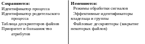 Возвращается: при удачном завершении 0, в случае ошибки -1 (происходит возврат к первоначальной программе в точку после вызова exec()). Заметим, что выполнение “нового” тела происходит в рамках уже существующего процесса. То есть после вызова exec() сохраняется идентификатор процесса, и идентификатор родительского процесса, таблица дескрипторов файлов, приоритет, и большая часть других атрибутов процесса. Фактически происходит замена сегмента кода и сегмента данных.