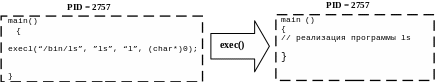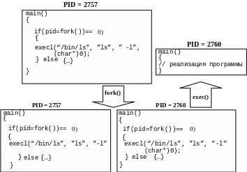 В этом примере выполнялся некоторый процесс. После вызова exec() его тело полностью заменилось на тело программы ls, если она была найдена. Процесс закончит свое существование после окончания работы ls. Если произойдет ошибка, процесс продолжит свое выполнение с точки, сразу после exec(), в данном случае выведет строку.