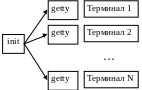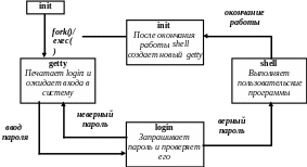 Init – это диспетчер, который отслеживает многопользовательскую работу. Существуют зарегистрированные терминалы, некоторые из которых включены. Для последних init активизирует getty. getty запрашивает и проверяет логин и пароль. В случае их правильности getty завершается, и начинается сеанс работы с системой (особый файл), запускается shell. Конец работы shell’а – это конец файла, поставленный либо как exit (logout), либо Ctrl+D. После завершения работы shell’а init порождает новый getty.