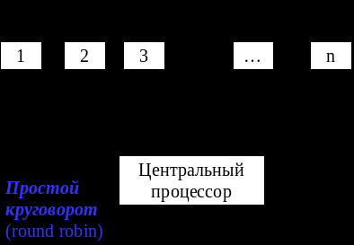 Простой круговорот (RR – round robin) не использует никакой статистической или динамической информации о приоритетах. (см. рисунок выше)