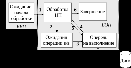 Процесс, войдя в систему ждет пока его приоритет не достигнет приоритета работающих процессов, а далее выполняется в круговороте.