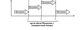 Рассмотрим схему организации мультипрограммного режима (Рис. 43.). Пускай в начальный момент времени на процессоре обрабатывается Программа 1, которая в некоторый момент времени t1 выдает запрос на обмен, при этом дальнейшая обработка на процессоре невозможна до завершения этого обмена. В случае синхронной организации Программа 1 будет приостановлена, и процессор будет простаивать до завершения обмена Программы 1. Соответственно, со временем последовало естественное предложение запускать на обработку центральным процессором других программ, пока Программа 1 ожидает завершения своего обмена. На рисунке проиллюстрирована ситуация, когда при запуске обмена для Программы 1 на счет ставится Программа 2, которая выполняется до некоторого момента времени t2, после чего она приостанавливается по тем или иным причинам, и запускается Программа 3. После завершения обмена на обработку вновь ставится Программа 1, сменяя Программу 3 в момент времени t3.
