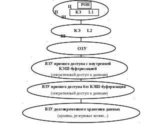 Рассматривая вычислительную систему, или компьютер, можно выстроить некоторую последовательность устройств, предназначенных для хранения информации в некотором ранжированном порядке, иерархии. Этот порядок можно определять на основе различных критериев: например, по стоимости хранения единицы информации или по скорости доступа к данным, но так или иначе устройства будут располагаться примерно в одном порядке (Рис. 42.).