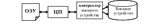 Следующая модель предлагает синхронное управление внешними устройствами с использованием контроллеров внешних устройств (Рис. 40.). Данная модель появилась вслед за появлением внешних устройств, для которых имелись электронные схемы управления этими устройствами — контроллеры, — взявшие на себя часть работ центрального процессора по управлению обменами. В этом случае контроллер взаимодействует с центральным процессором блоками больших размеров, при этом контроллер может самостоятельно выполнять некоторые работы по непосредственному управлению ВЗУ (например, пытаться локализовать и исправить возможные ошибки, которые могут случиться при чтении или записи данных). Но исторически такой тип управления ВЗУ изначально был синхронным: процессор посылает устройству команды на обмен и ожидает, когда этот обмен завершится. Что касается потока данных, то ничего нового в данной модели не представлено: процессор по-прежнему считывает их со специальных регистров внешнего устройства и помещает их в оперативную память.