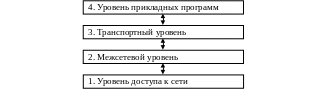 Рассмотрим еще одну модель организации сетевого взаимодействия — семейство протоколов TCP/IP (Рис. 60.). Это классическая четырехуровневая модель организации сетевого взаимодействия. Протоколы семейства TCP/IP основаны на сети коммутации пакетов. Изначально данные протоколы были разработаны как стандарт военных протоколов министерства обороны США в агентстве перспективных разработок МО США DARPA. Это агентство разработало сеть ARPA-net, которая в своем развитии легла в основу современной сети Internet (поскольку это семейство протоколов было интегрировано в ОС BSD Unix).