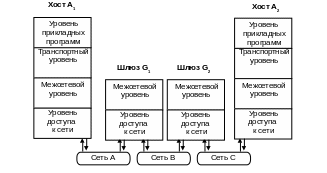 Рассмотрим пример (Рис. 63.). Пускай необходимо послать сообщение от машины A1 машине A2. Машина A1 находится в сети A, а машина A2 — в сети C, причем сеть A соединена лишь с сетью B посредством шлюза G1, а сеть C соединена также лишь с сетью B, но посредством шлюза G2. Соответственно, маршрутизатор должен учитывать эти особенности при решении задачи маршрутизации. Обратим ваше внимание, что на компьютерных шлюзах реализовано только два уровня протоколов, поскольку для решения задачи транспортировки пакетов из одной сети в другую достаточны лишь наличие этих двух уровней.