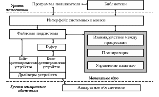 Итак, каждый слой предоставляет определенный сервис вышестоящему слою. Деление на слои является индивидуальным для каждой конкретной операционной системы. Это может быть слой файловой системы, слой управления внешними устройствами и т.д. Тогда модернизация подобных систем сводится к модернизации соответствующих слоев. Вследствие чего проблема несколько упрощается, но при этом остаются ограничения на структурную организацию (например, имея слой файловой системы, можно заменить его другим вариантом этого слоя, но использовать одновременно две различные файловые системы не представляется возможным).