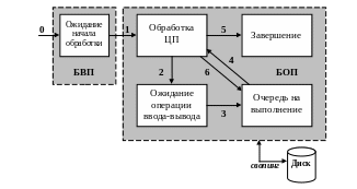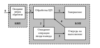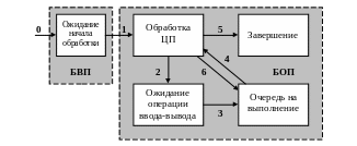 Модель пакетной мультипроцессной системы. 0 — поступление процесса в очередь на начало обработки ЦП (процесс попадает в БВП). 1 — начало обработки процесса на ЦП (из БВП в БОП). 2 — процесс прекращает обработку ЦП по причине ожидания операции ввода-вывода, поступает в очередь завершения операции обмена (БОП). 3 — операция обмена завершена, и процесс поступает в очередь ожидания продолжения выполнения ЦП (БОП). 4 — выбирается процесс для выполнения на ЦП. 5 — завершение выполнения процесса, освобождение системных ресурсов.