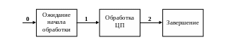 Модель пакетной однопроцессной системы. 0 — поступление процесса в очередь на начало обработки ЦП (процесс попадает в БВП). 1 — начало обработки процесса на ЦП (из БВП в БОП). 2 — Завершение выполнения процесса, освобождение системных ресурсов.