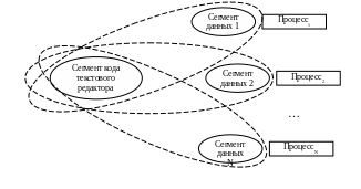 В ОС Unix реализована такая возможность, как разделение сегмента кода (Рис. 75.). Допустим, в системе работает несколько (пускай, 100) пользователей, каждый из которых помимо прочего работает с одним и тем же текстовым редактором. Таким образом, в системе обрабатываются 100 копий текстового редактора. Ставится вопрос о необходимости держать в ОЗУ все сегменты кода для этих 100 процессов. Для оптимизации подобных ситуаций в ОС Unix используется указанный механизм разделения сегмента кода. Тогда каждый обрабатываемый в системе процесс текстового редактора в пользовательской составляющей хранит ссылку на единственную копию сегмента кода редактора, а сегмент данных у каждого из процессов оказывается своим. Соответственно, в приведенном примере в памяти будут находиться один сегмент кода и 100 сегментов данных. Но рассмотренный механизм может иметь место в ОС только в том случае, когда сегмент кода нельзя изменить: он закрыт на запись.
