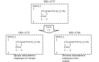 Рассмотрим пример (Рис. 76.). Пускай в системе обрабатывается процесс с идентификатором 2757. В некоторый момент времени этот процесс обращается к системному вызову fork(), в результате чего в системе появляется новый процесс, который, предположим, имеет идентификатор 2760. Сразу оговоримся, что дочерний процесс может получить совершенно произвольный идентификатор, отличный от нуля и единицы (обычно система выделяет новому процессу первую свободную запись в таблице процессов). По выходу из системного вызова fork() процесс 2757 продолжит свое выполнение с первой команды из then-блока, а дочерний процесс 2760 — с первой команды из else-блока. Далее эти процессы ведут себя независимо с точки зрения системного управления процессами: в частности, порядок их обработки на процессоре в общем случае пользователю неизвестен и зависит от той или иной реализованной в системе стратегии планирования времени процессора.