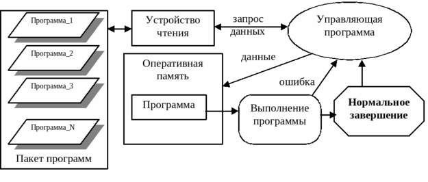 Этапом в развитии форм использования компьютеров стала пакетная обработка заданий, суть которой состояла в следующем. В компьютере работала специальная управляющая программа, в функции которой входила последовательная загрузка в оперативную память и запуск на выполнение программ из заранее подготовленного пакета программ. Пакет программ физически может быть представлен в виде «большой» стопки перфокарт, в которой программы находятся последовательно. В этом случае управляющая программа по завершении выполнения текущей программы осуществляет чтение очередной программы через устройство считывания перфокарт, загрузку ее в оперативную память и передача управления на фиксированную точку входа в программу (адрес памяти с которого должно начинаться выполнение программы). По завершении программы или после возникновения в программе ошибки, которая вызывает аварийную остановку выполнения программы, управление передается в управляющую программу (Рис. 1.).