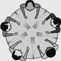 Обедающие философы (Рис. 86.). Пускай существует круглый стол, за которым сидит группа философов: они пришли пообщаться и покушать. Кушают они спагетти, которое находится в общей миске, стоящей в центре стола. Для приема пищи они пользуются двумя вилками: одна в левой руке, другая — в правой. Вилки располагаются по одной между каждыми двумя философами. Любой философ может взять обе вилки, покушать, затем положить вилки на стол, после этого вилки может взять его сосед и повторить эти действия. Если мы организуем работу таким образом, что любой философ, желающий поесть, берет сначала левую вилку, затем правую, после чего начинает кушать, то в какой-то момент может возникнуть ситуация тупика (когда каждый возьмет по одной левой вилке, а правая будет захвачена соседом).