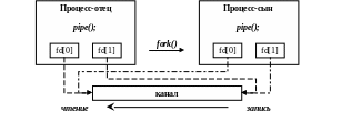 Аргументом данного системного вызова является массив fd из двух целочисленных элементов. Если системный вызов pipe() прорабатывает успешно, то он возвращает код ответа, равный нулю, а массив будет содержать два открытых файловых дескриптора. Соответственно, в fd[0] будет содержаться дескриптор чтения из канала, а в fd[1] — дескриптор записи в канал. После этого с данными файловыми дескрипторами можно использовать всевозможные средства работы с файлами, поддерживающие стратегию FIFO, т.е. любые операции работы с файлами, за исключением тех, которые касаются перемещения файлового указателя.