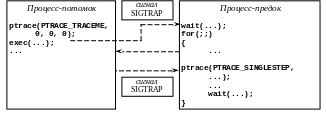 Рассмотрим типовую схему организации трассировки. Будем рассматривать взаимодействие родительского процесса-отладчика с подчиненным дочерним процессом (Рис. 89.).