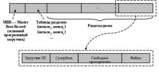 Логическая структура раздела имеет следующий вид. В начальном блоке раздела находится загрузчик конкретной операционной системы. Все остальное пространство раздела обычно занимает файловая система. Зачастую в файловой системе часть пространства выделяется т.н. суперблоку, в котором хранятся настройки (размеры блоков, режимы работы и т.п.) и информация об актуальном состоянии (информация о свободных и занятых блоках и т.п.) файловой системы. Все оставшееся пространство файловой системы состоит из свободных и занятых блоков, т.е. блоков, способных хранить системные и пользовательские данные.