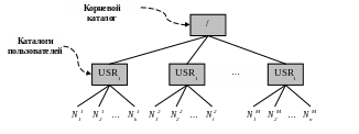 И, наконец, последняя модель, которую мы рассмотрим, — иерархическая файловая система (Рис. 95.). Современные многопользовательские файловые системы основываются на использовании иерархических структур данных, в частности, на использовании деревьев.