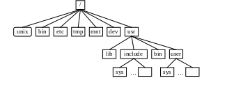 Прежде всего, необходимо отметить, что файловая система ОС Unix является иерархической древовидной файловой системой (Рис. 109.), т.е. у нее есть корневой каталог /, из которого за счет каталогов разных уровней вложенности «вырастает» целое дерево имен файлов.