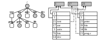 Организация блоков файла — еще одна удачная особенность файловой системы ОС Unix. Структура организации блоков файла выглядит следующим образом. Массив блоков файла состоит из 13 элементов. Первые 10 элементов используются для указания номеров первых десяти блоков файла, оставшиеся три элемента используются для организации косвенной адресации блоков. Так, одиннадцатый элемент ссылается на массив из N номеров блоков файла, двенадцатый — на массив из N ссылок, каждая из которых ссылается на массив из N блоков файла, тринадцатый элемент используется уже для трехуровневой косвенной адресации блоков.