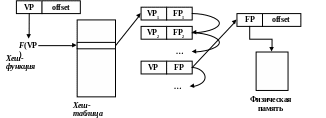 Модель преобразования адресов, основанная на хешировании, достаточно проста. Из виртуального адреса аппаратно извлекается номер виртуальной страницы, который подается на вход некоторой хеш-функции, отображающей значение на аппаратную таблицу (т.н. хеш-таблицу) фиксированного размера. Каждая запись в данной таблице хранит начало списка коллизий, где каждый элемент списка является парой: номер виртуальной страницы — соответствующий ему номер физической страницы. Итак, перебирая соответствующий список коллизии, можно найти номер исходной виртуальной страницы и соответствующий номер физической страницы. Подобное решение имеет свои достоинства и недостатки: в частности, возникают проблемы с перемещением списков коллизий.