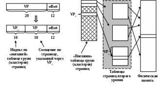 Пускай имеется 32-разрядный виртуальный адрес, который в свете рассмотренной ранее модели может, например, содержать 20-разрядный номер виртуальной страницы и 12-разрядного значения смещения в ней. Если же используется двухуровневая иерархическая организация, то этот же виртуальный адрес можно трактовать, к примеру, как 10-разрядный индекс во «внешней» таблице групп, или кластеров, страниц, 10-разрядное смещение в таблице второго уровня и, наконец, 12-разрядное смещение в физической странице. Соответственно, чтобы получить номер физической страницы необходимо по индексу во «внешней» таблице групп страниц найти необходимую ячейку, содержащую начальный адрес таблицы второго уровня, затем по этому адресу и по значению смещения в виртуальном адресе находится нужная запись в таблице страниц второго уровня, которая уже и содержит номер соответствующей физической страницы.
