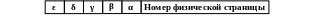 Модельная структура записи таблицы страниц. Здесь: α — присутствие/ отсутствие; β — защита (чтение, чтение/запись, выполнение); γ — изменения; δ — обращение (чтение, запись, выполнение); ε — блокировка кэширования.