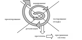 Современные технологии разработки программного обеспечения помимо каскадной модели используют и другие модели организации жизненного цикла программных систем. В частности, популярной является спиральная модель организации жизненного цикла (Рис. 12.).