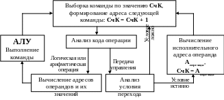 Если это команда передачи управления, то происходит анализ условий перехода (анализируется содержимое кода признака результата предыдущей арифметико-логической команды с условиями перехода, соответствующими команде). Если условие перехода не выполняется, то переход на п.1. Иначе, вычисляется исполнительный адрес операнда Аперехода , затем: СчК = Аперехода, переход на п.1.