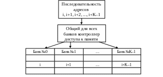 Все ОЗУ состоит из K банков, каждый из которых может работать независимо. Ячейки памяти распределены между банками таким образом, что у любой ячейки ее соседи размещаются в соседних блоках. Что дает подобная организация памяти? Расслоение памяти позволяет во многом сократить задержки, возникающие из-за несоответствия времени доступа и цикла памяти при выполнении последовательного доступа к ячейкам памяти, т.к. при расслоении ОЗУ задержки, связанные с циклом памяти, будут возникать только в тех случаях, когда подряд идущие обращения попадают в один и тот же банк памяти. Используя организацию параллельной работы банков, в идеальном случае, можно повысить производительность работы ОЗУ в K раз. Для этих целей необходимо использовать более сложную архитектуру системы управления памятью.
