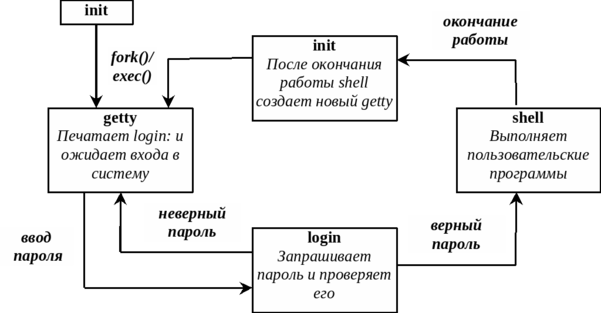 Далее ядро копирует "0" процесс и создает "1" процесс. Алгоритм создания этого процесса напоминает стандартную процедуру, хотя и носит упрощенный характер. Сначала процесс "1" представляет собой полную копию процесса "0" , т.е. у него нет области кода. Далее происходит увеличение его размера и во вновь созданную кодовую область копируется программа, реализующая системный вызов exec() , необходимый для выполнения программы /etc/init. На этом завершается подготовка первых двух процессов. Первый из них представляет собой структуру данных, при помощи которой ядро организует мультипрограммный режим и управление процессами. Второй – это уже подобие реального процесса. Далее ОС переходит к выполнению программ диспетчера. Диспетчер наделен обычными функциями и на первом этапе у него нет выбора – он запускает exec() , который заменит команды процесса "1" кодом, содержащимся в файле /etc/init. Получившийся процесс, называемый init, призван настраивать структуры процессов системы. Далее он подключает интерпретатор команд к системной консоли. Так возникает однопользовательский режим, так как консоль регистрируется с корневыми привилегиями и доступ по каким-либо другим линиям связи невозможен. При выходе из однопользовательского режима init создает многопользовательскую среду. С этой целью init организует процесс getty для каждого активного канала связи, т.е. каждого терминала Это программа ожидает входа кого-либо по каналу связи. Далее, используя системный вызов exec(), getty передает управление программе login, проверяющей пароль. Во время работы ОС процесс init ожидает завершения одного из порожденных им процессов, после чего он активизируется и создает новую программу getty для соответствующего терминала. Таким образом процесс init поддерживает многопользовательскую структуру во время функционирования системы. Схема описанного “круговорота” представлена на Error: Reference source not found